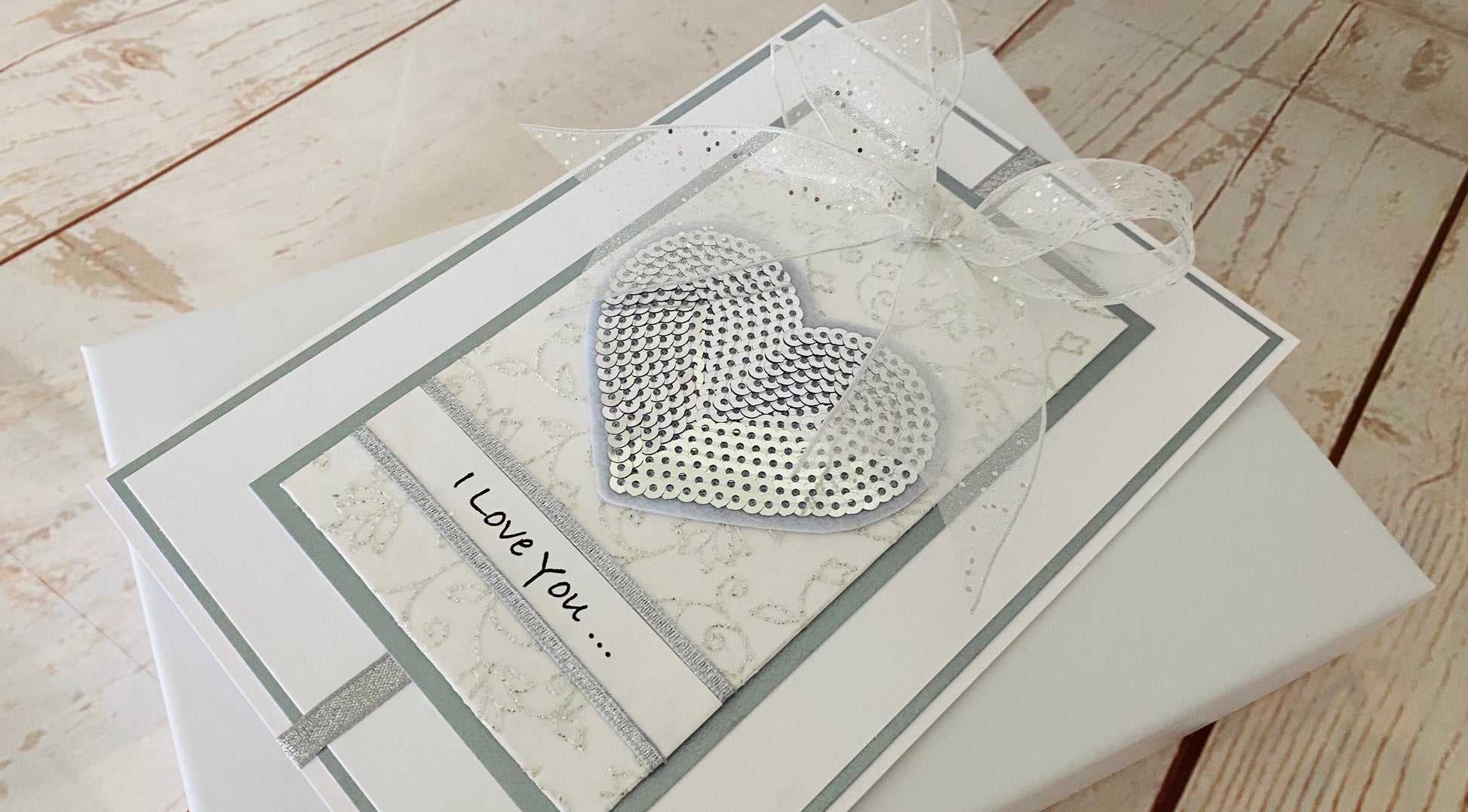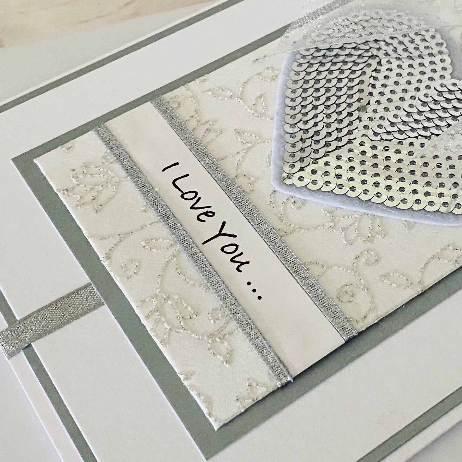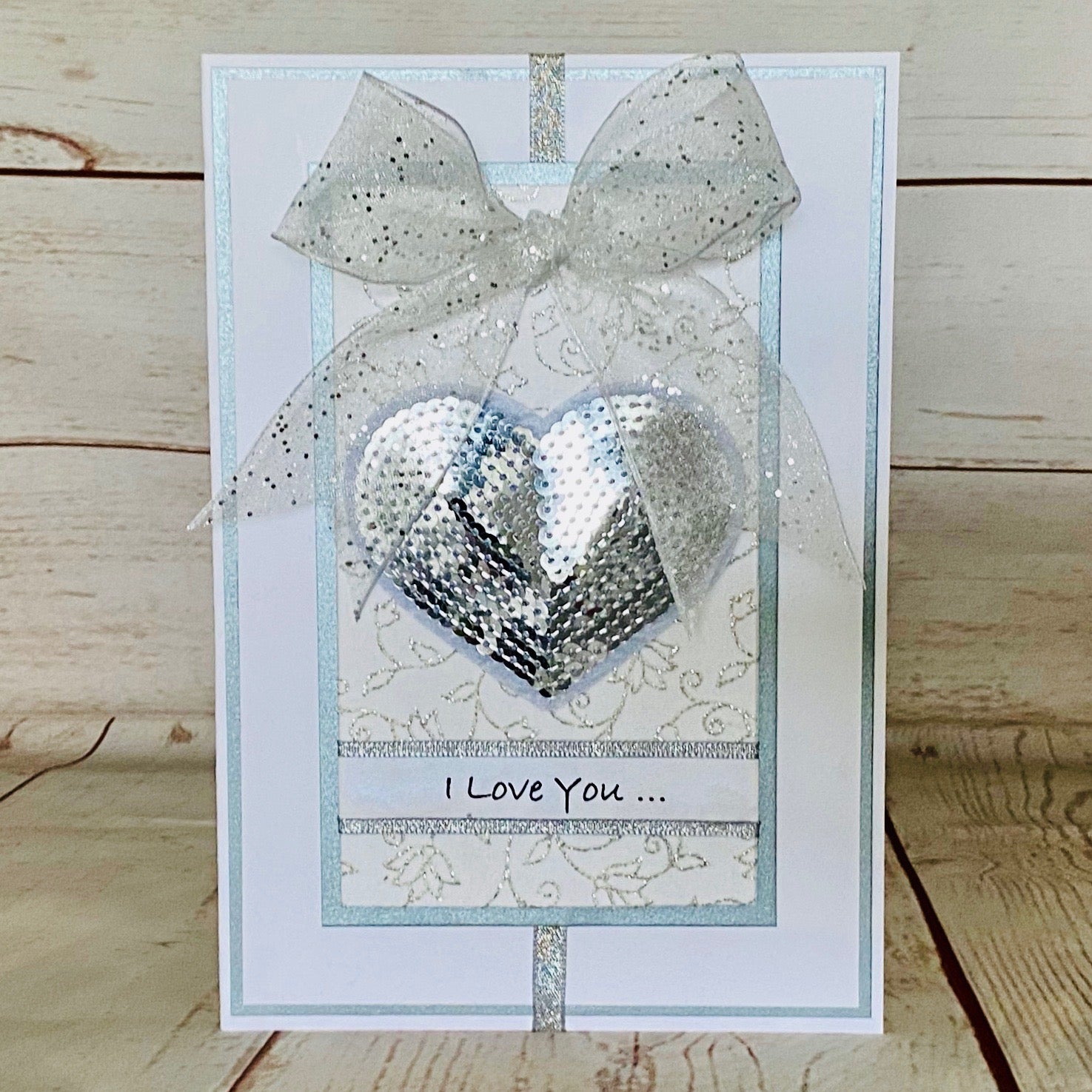 Dazzling large silver heart created from hundreds of tiny sequins sewn onto soft felt, mounted onto pretty sliver glitter floral fabric paper. Gorgeous designer glitter hand tied bow and luxury metallic lame ribbons - a fabulous shiny eyecatching hand made card. Suitable for Engagements, Weddings or Anniversaries.