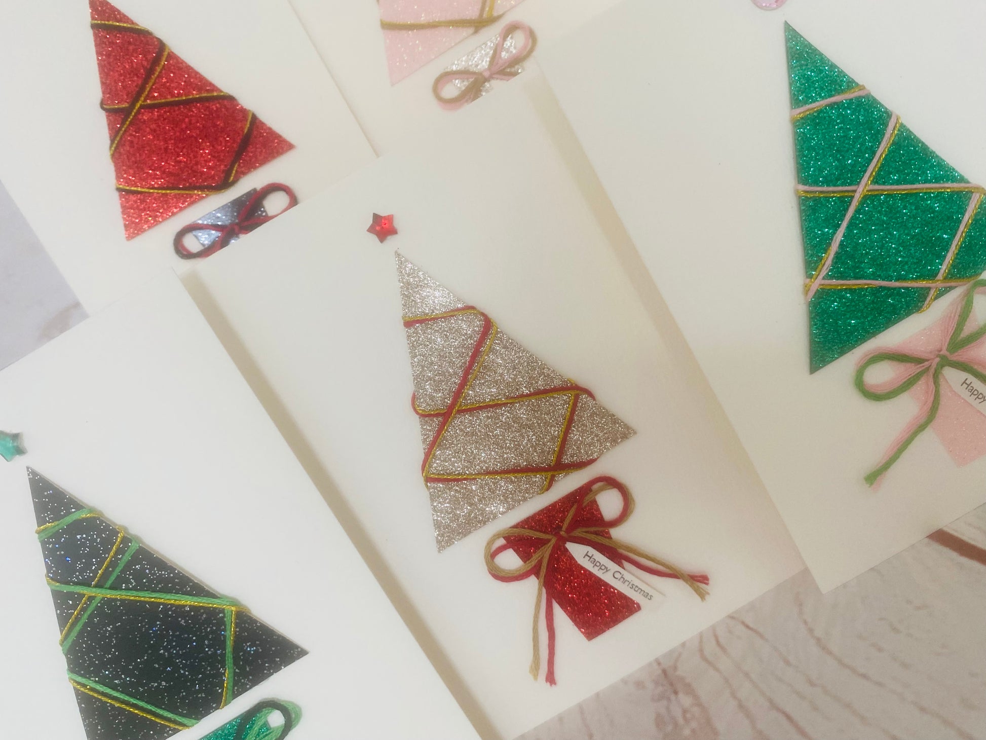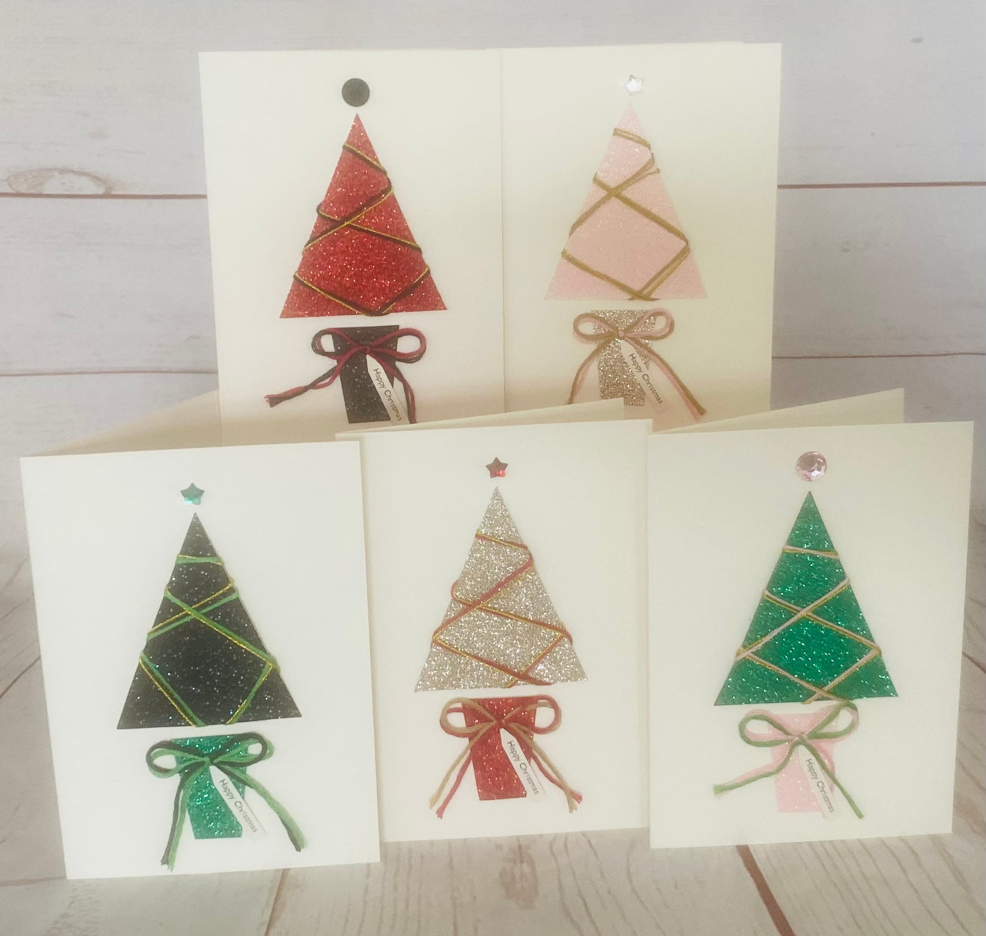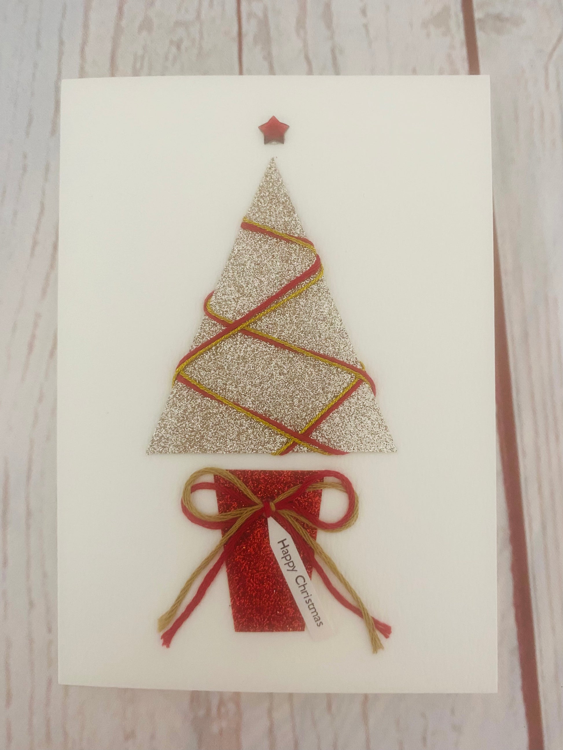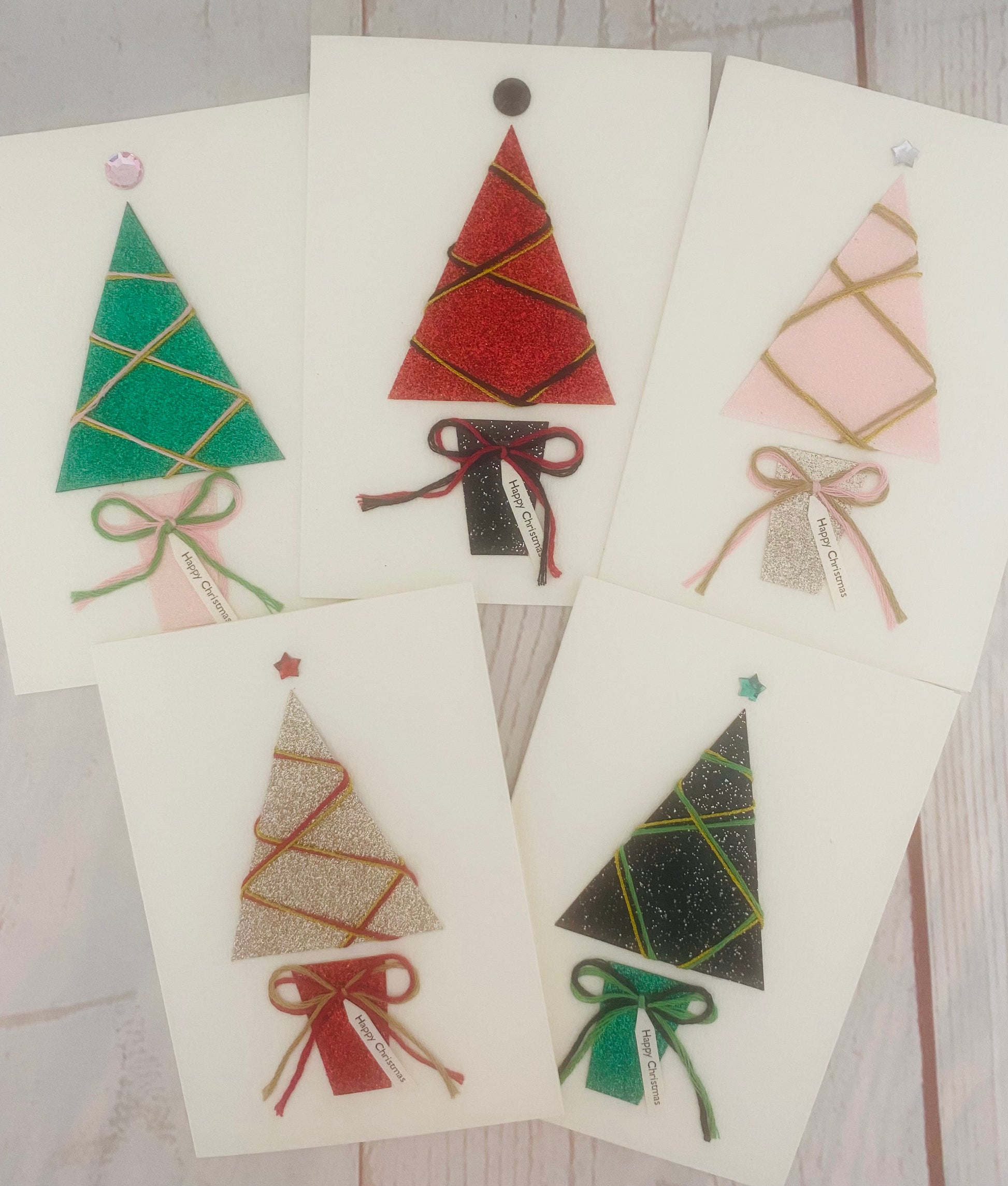Glitter card Christmas tree and pot, in 5 different colourways, decorated with co-ordinating threads, finished off with a diamante topper ... perfect for family, friends or corporate use.