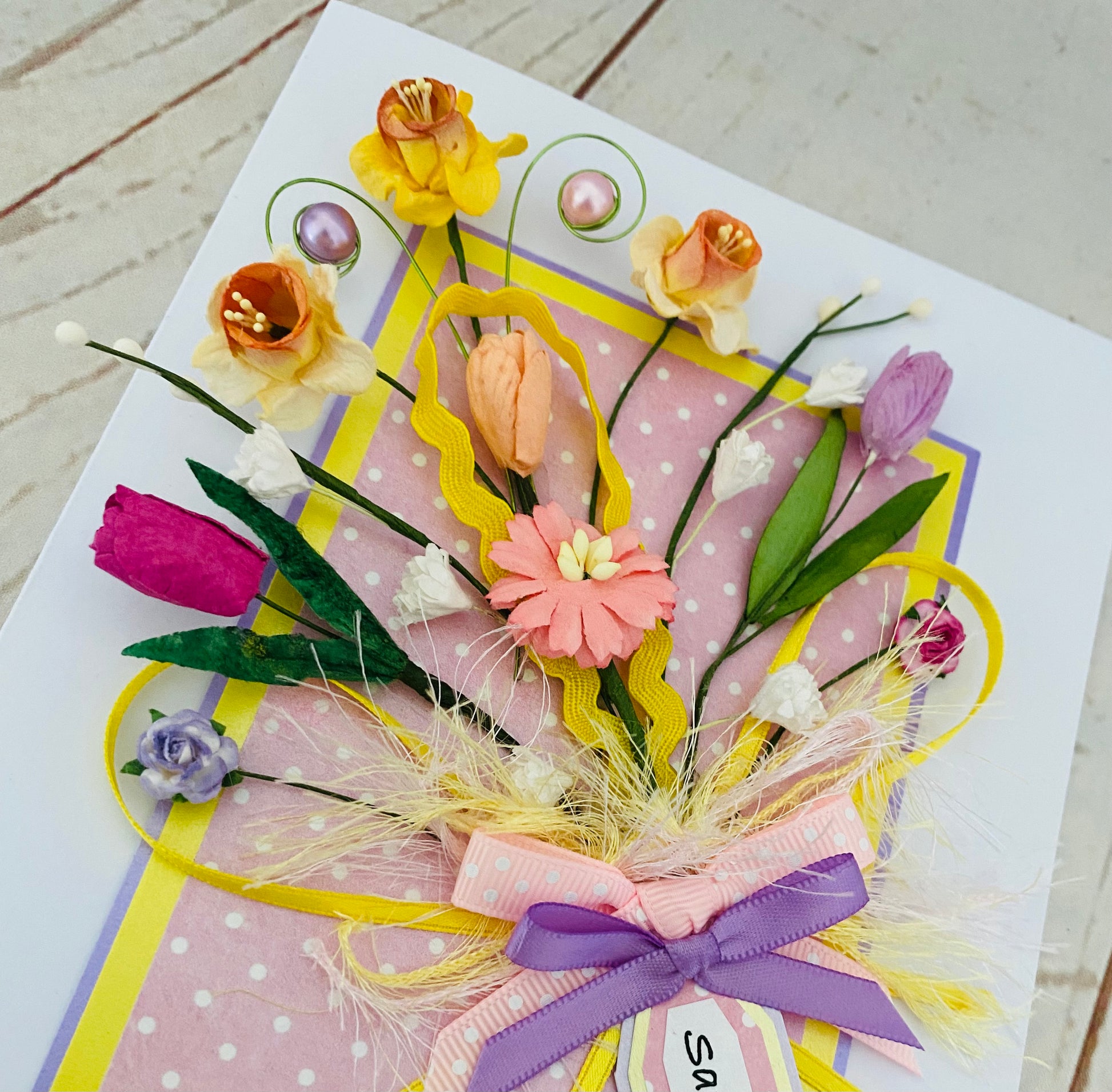 Absolutely beautiful hand tied spring themed flower bouquet with delightful daffodils, tulips, roses etc.. Pastel bead sprays, fresh green foliage, loops of yelllow satin curly ribbon and silky textured yarns. Suitable for multiple occasions, bitrhdays, Mothers Day, Easter to name a few.