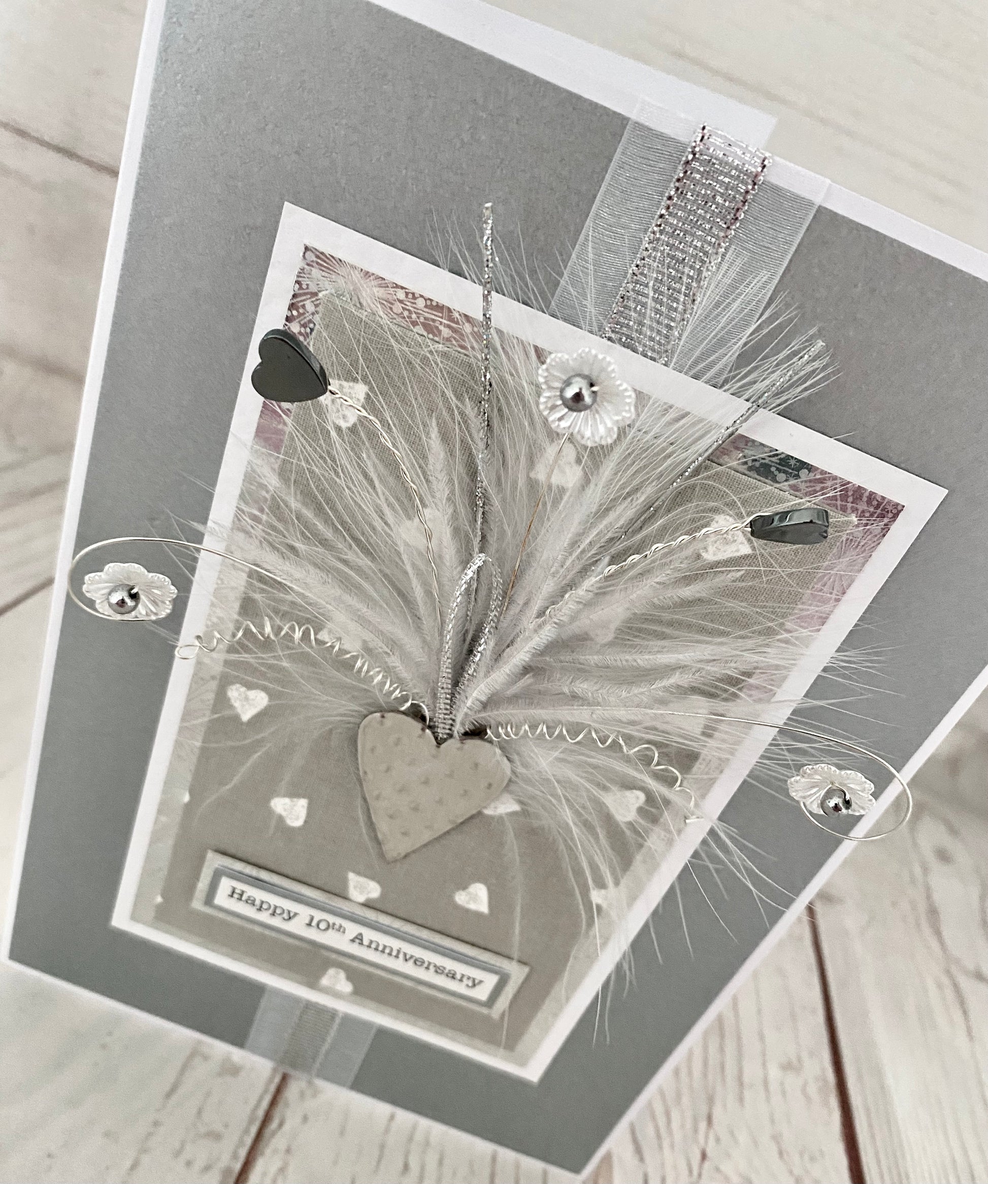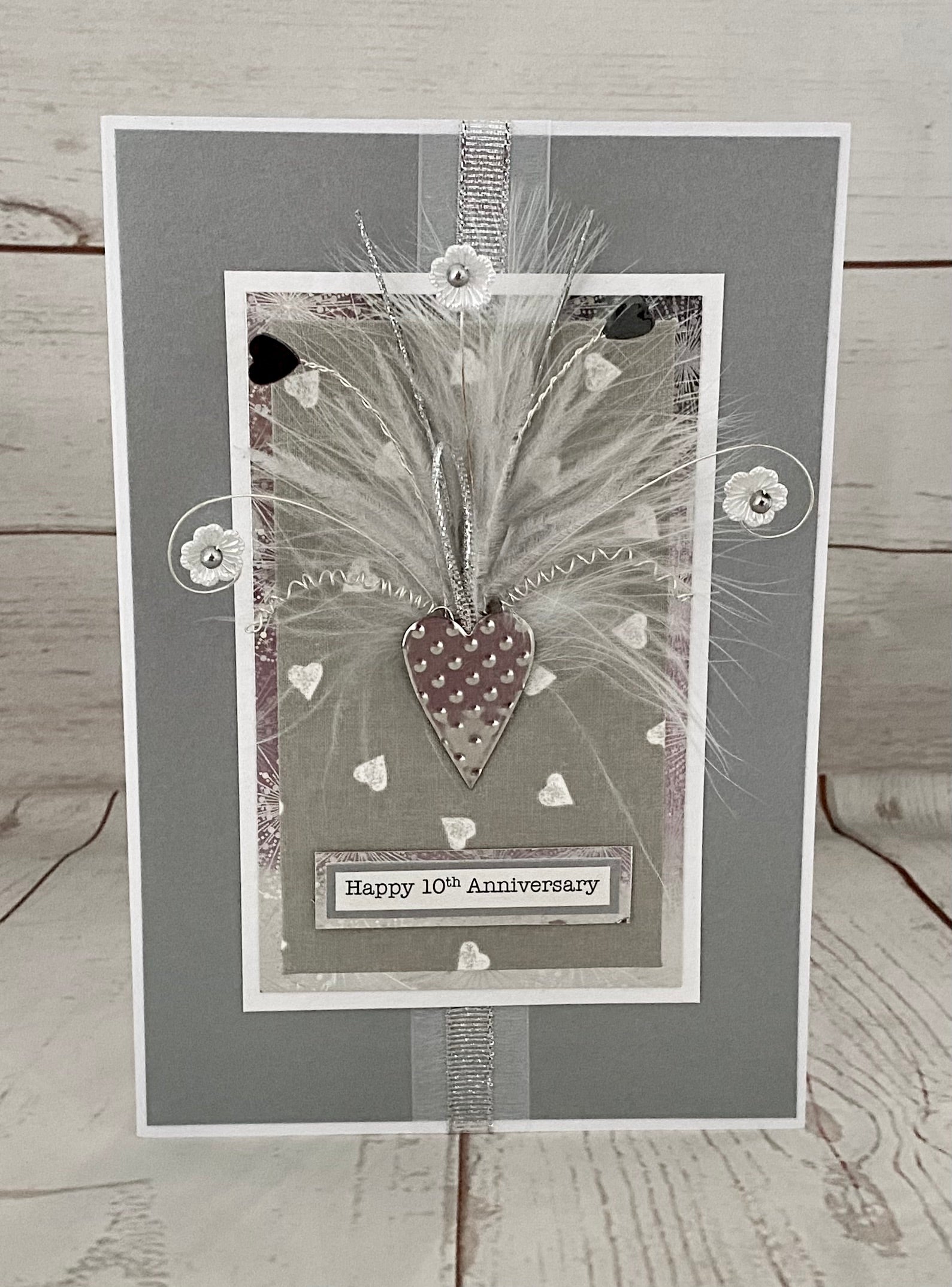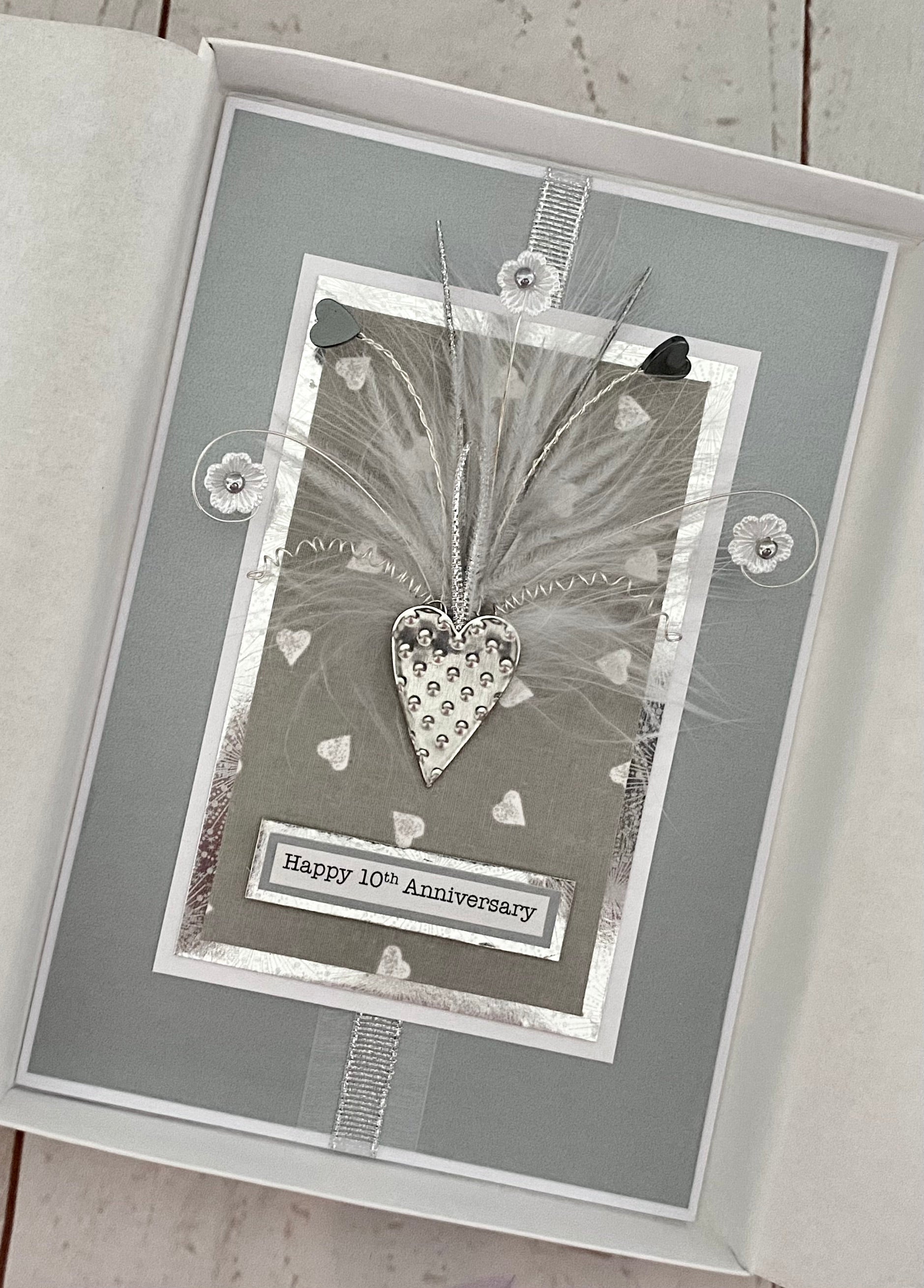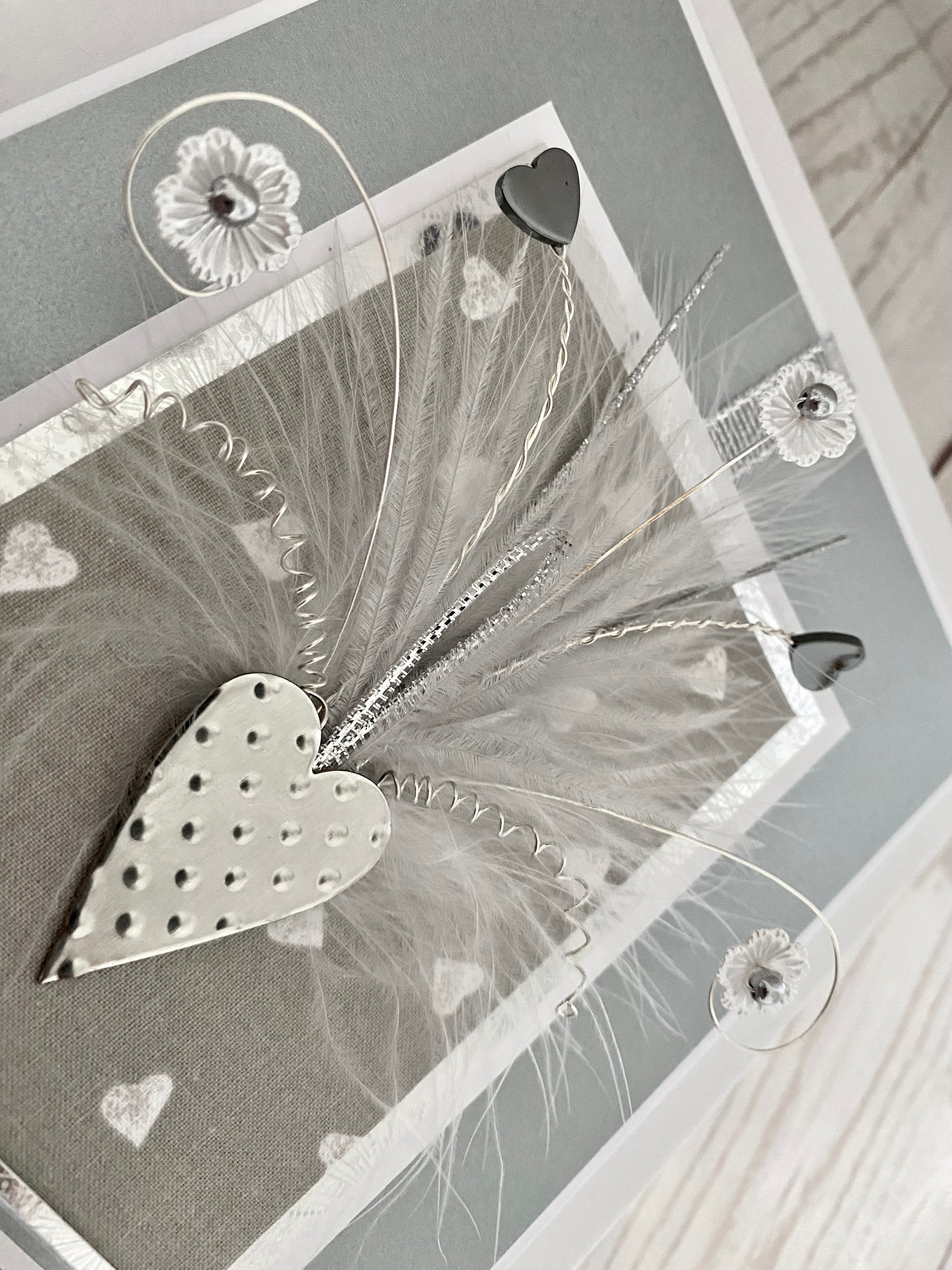 A pressed tin heart with an explosion of luxury hematite hearts, delicate ivory pearescent flowers, sticks of silver glitter, wire twizzles, metallic ribbon, white maribou and grey ostrich feathers all mounted on designer grey & white heart fabric and metallic card. Ideal for that special person in your life!