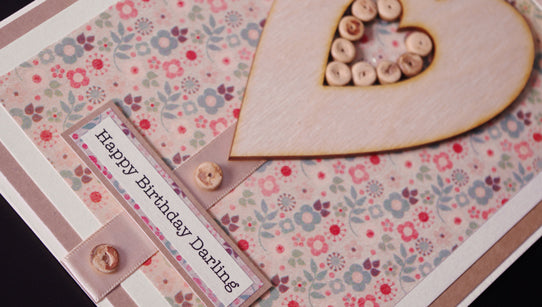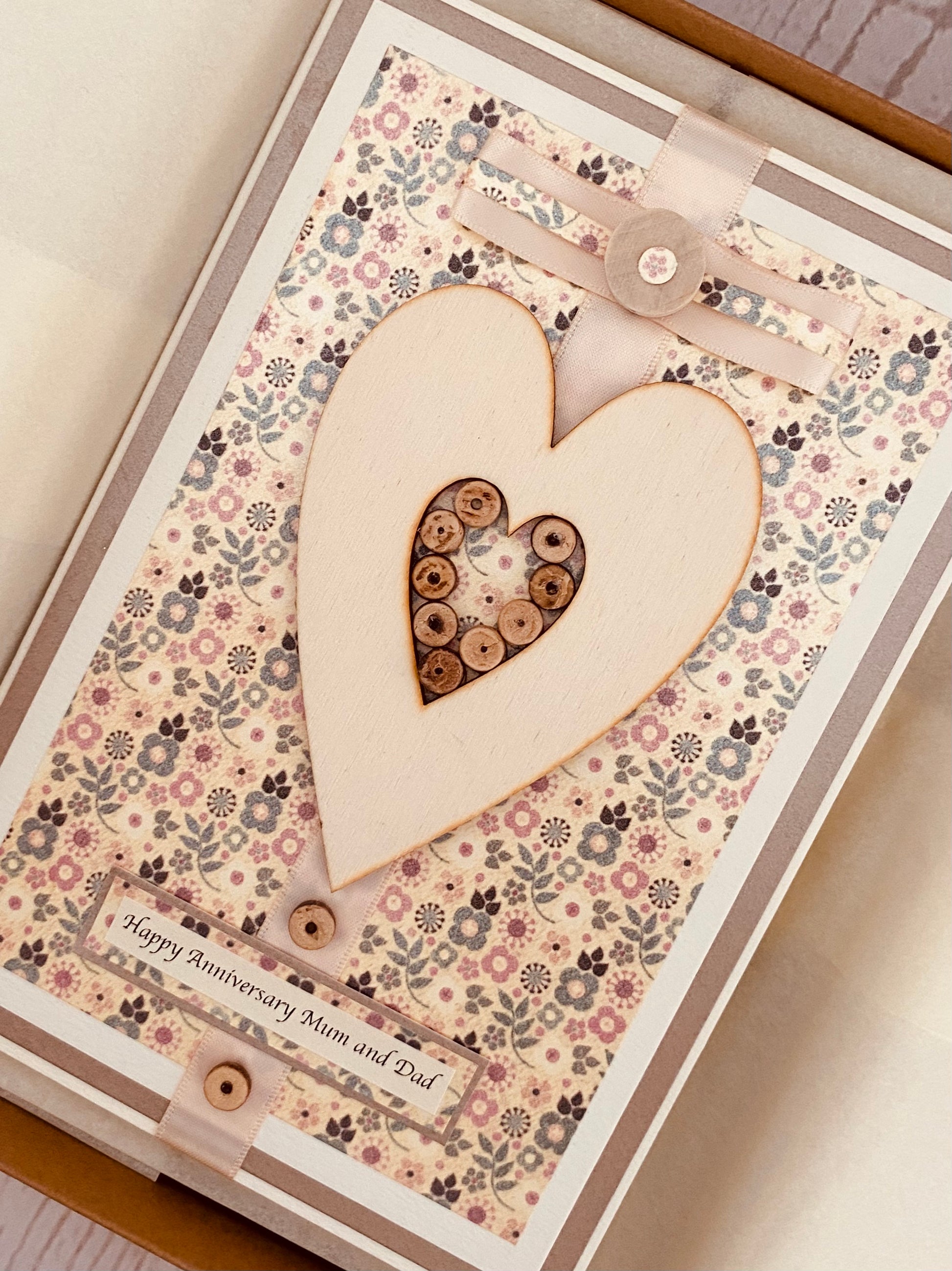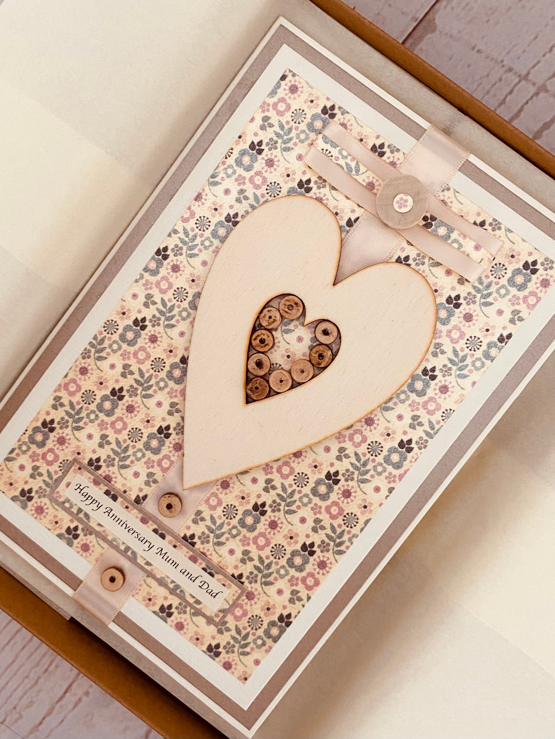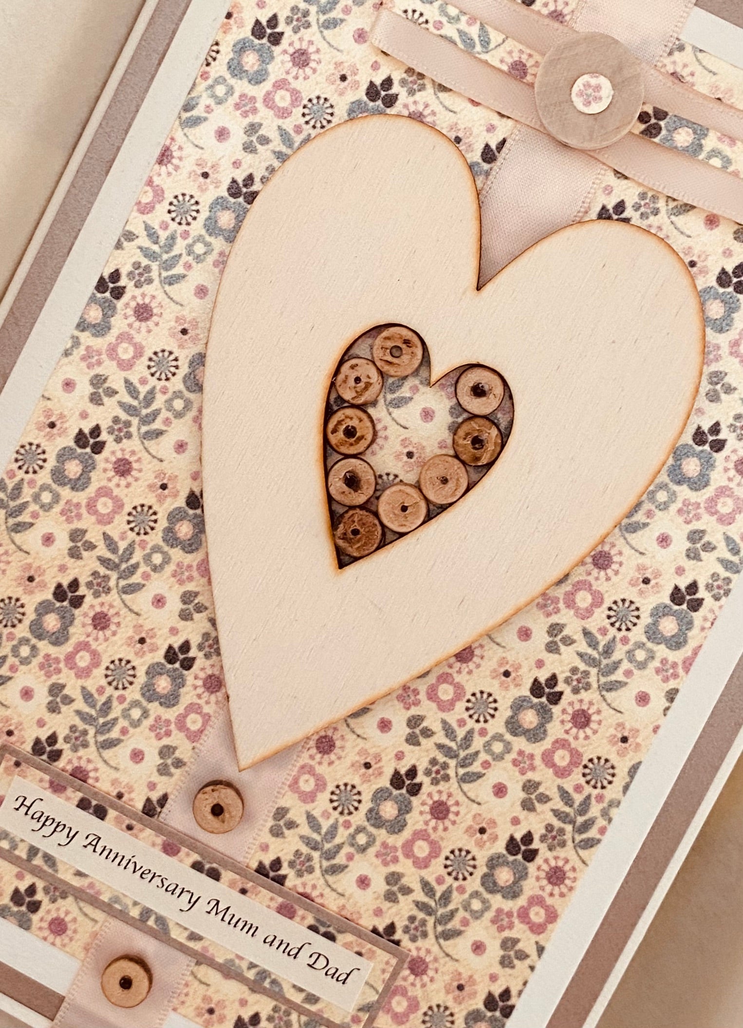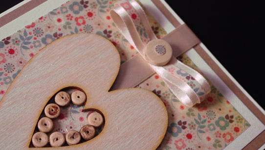 A large fashionable wooden heart with a beautiful nude satin bow are mounted onto a pretty and stylish floral background. Miniature wooden beads create a 'heart within a heart'......artistic and tasteful card design.