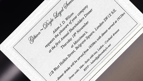 Extremely high quality layered Corporate invite.Two layers of Conqueror 320g textured white card and a then a printed top layer of Conqueror pearlescent 120g paper. Very superior invitation.